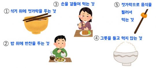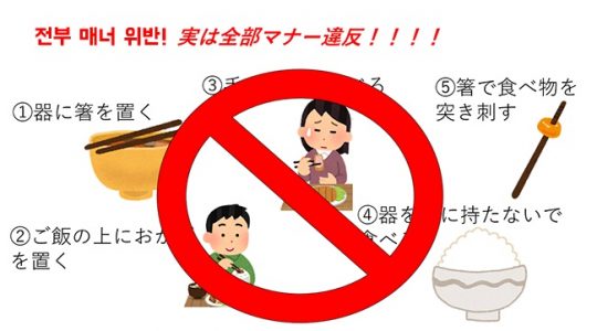 은 매너 위반이다. 일본 친구에게 무심코 젓가락으로 음식을 집어 “이거 맛있어. 한 번 먹어봐.”라고 할 때가 있는데 일본 생활에서는 꼭 주의해야 한다.