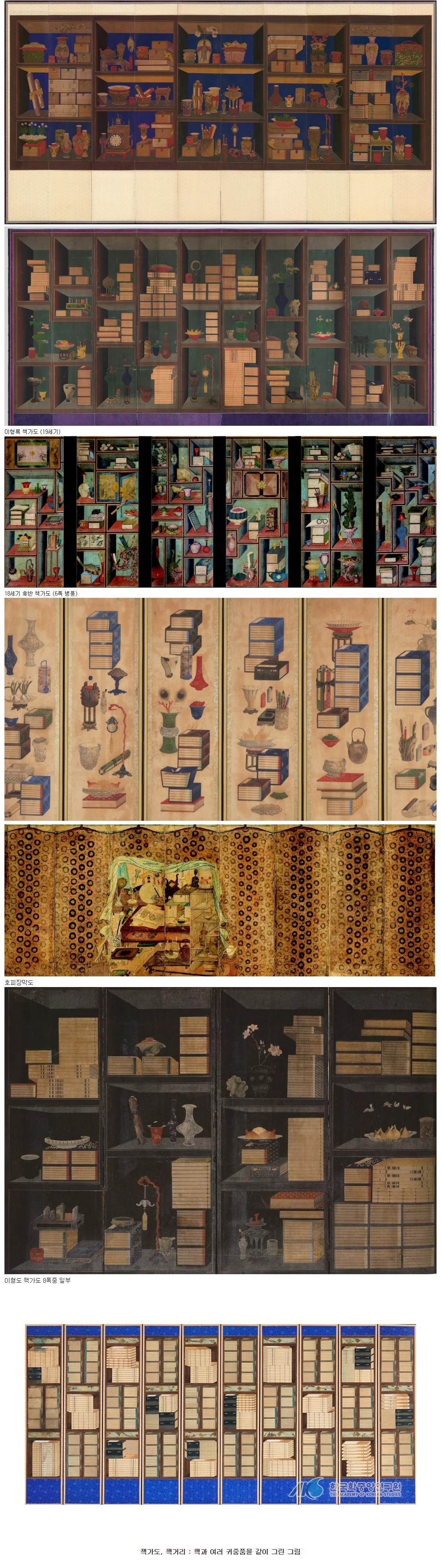 특히 궁중화원이 그린 책가도가 많다는 것은 왕실에서도 그 쓰임새가 많았던 것을 의미합니다. 일찍이 정조는 어좌 뒤에 일월오봉도 대신 책가도를 배치하였다고 하며 “책을 즐겨 읽지만 일이 많아 책을 볼 시간이 없을 때는 책가도를 보며 마음을 푼다.”라고 스스로 밝힌 바 있습니다. 이 같은 책 사랑은 조선 왕실에서 서민에 이르기까지 한결같았습니다.
